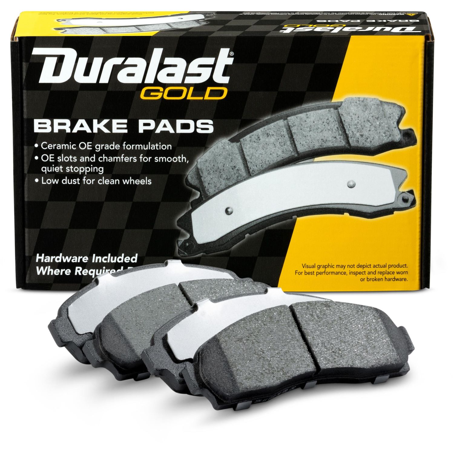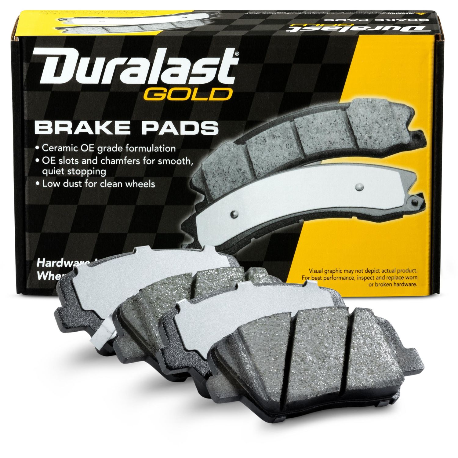 Duralast gold ceramic brake pads for a quieter ride and ultra low brake dust.