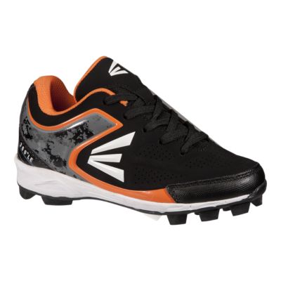 Easton kids 360 low cut baseball cleats black white orange.